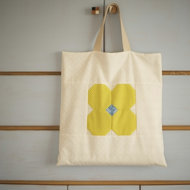真ん中にパッチワークのパターンを入れたバッグのキットです。 白と黄色で春に使いたくなるようなバッグ。 中袋はチェック柄でおしゃれな雰囲気です。 写真だと黒に見えますが、実際の生地は紺色です。 たくさん入るサイズなのでいつものお買い物に役立ちそう。 バッグの真ん中に入れたパターンはスノーボール(雪玉)のパターンです。 4つ組み合わせたら可愛いお花の形になりました。 出来上がりサイズ:42cm×40cm 持ち手40cm セット内容:表布、中袋、持ち手紐、作り方レシピ