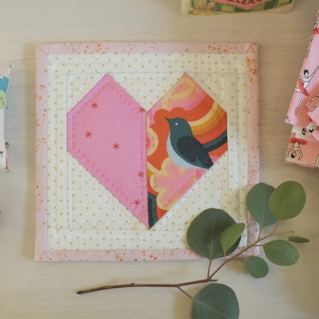 ハートのパターンのミニキルトのレシピです。 色々な色と柄で作っても可愛いです。 出来上がりサイズ:縦16.5cm×横16.5cm