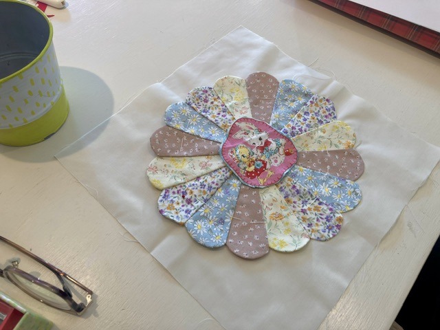 花柄生地をたくさん使ってドレスデンプレートのミニキルトを作られています。