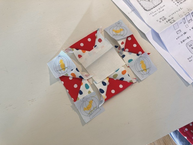 ファスナー付きのケースを作るとのことで、パッチワーク部分の布をカットして縫い合わせています。