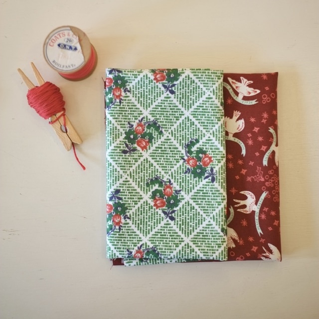 グリーンの布はフィードサックの柄をリサイズしたもので小物作りにも使いやすいと思います。