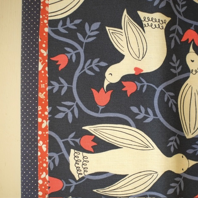 大胆な鳥と植物が描かれた生地を使った組み合わせです。