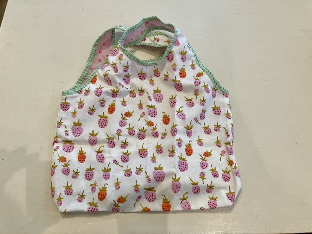 中袋もいちご柄でグリーンのパイピングがアクセントになっています。