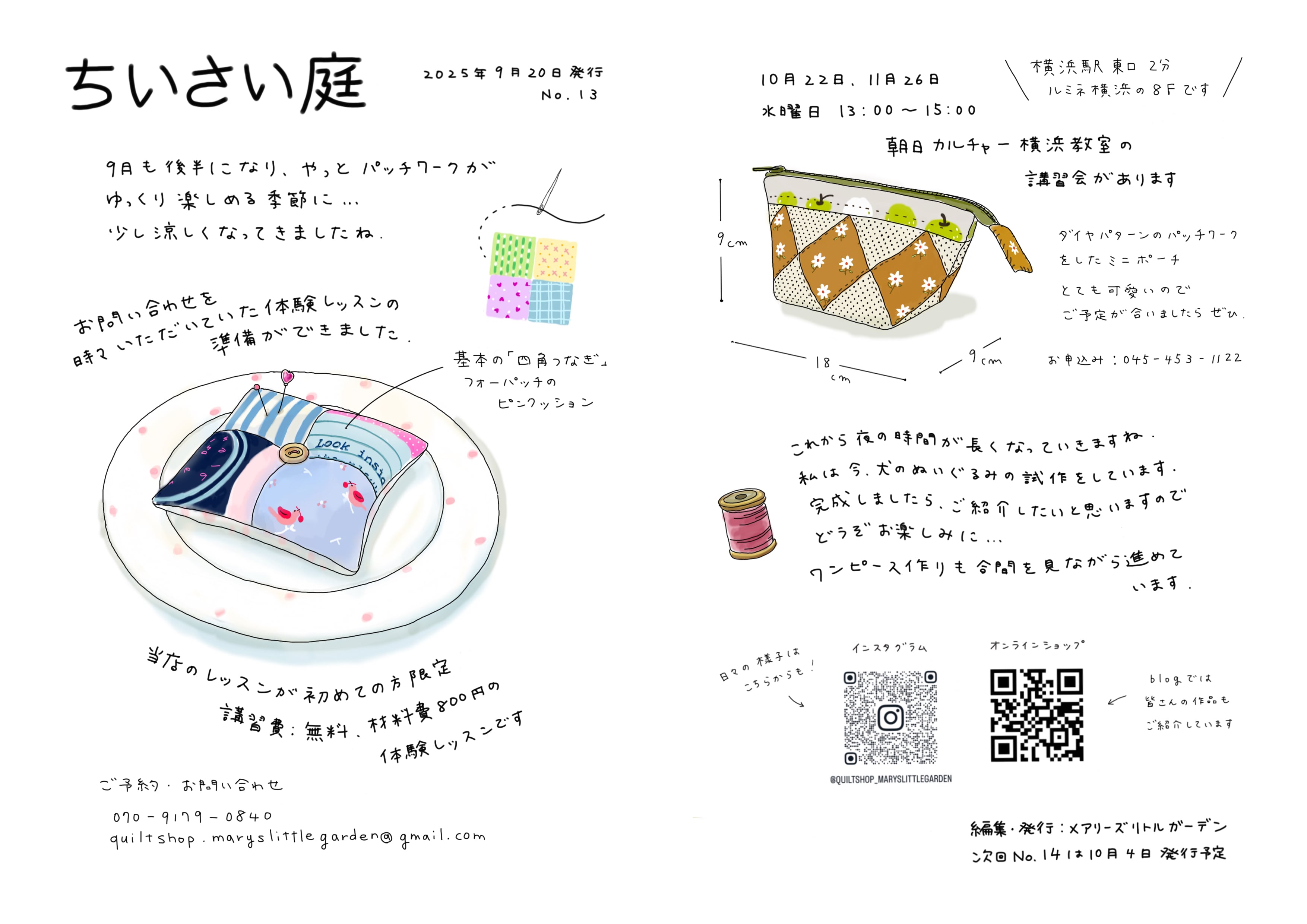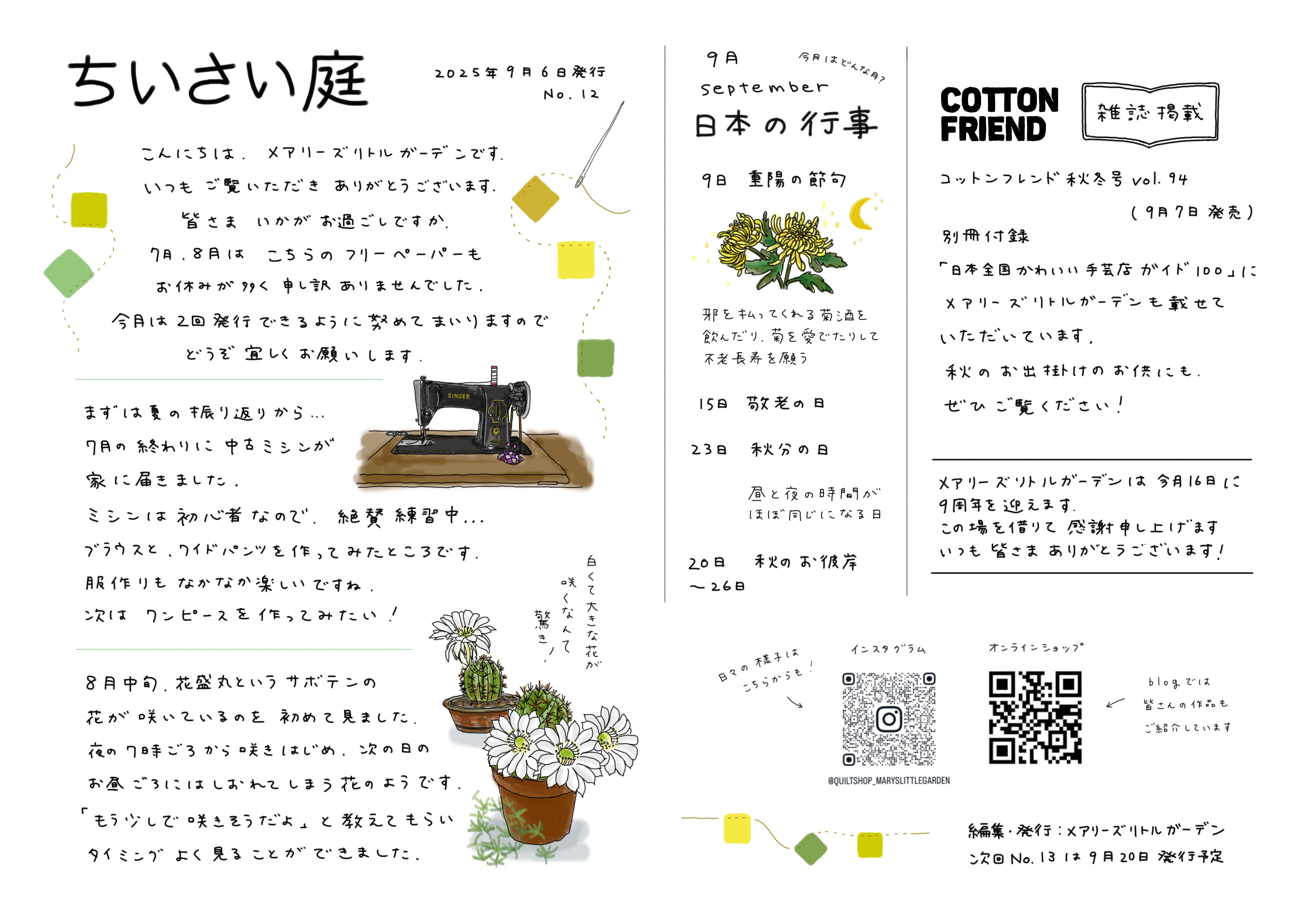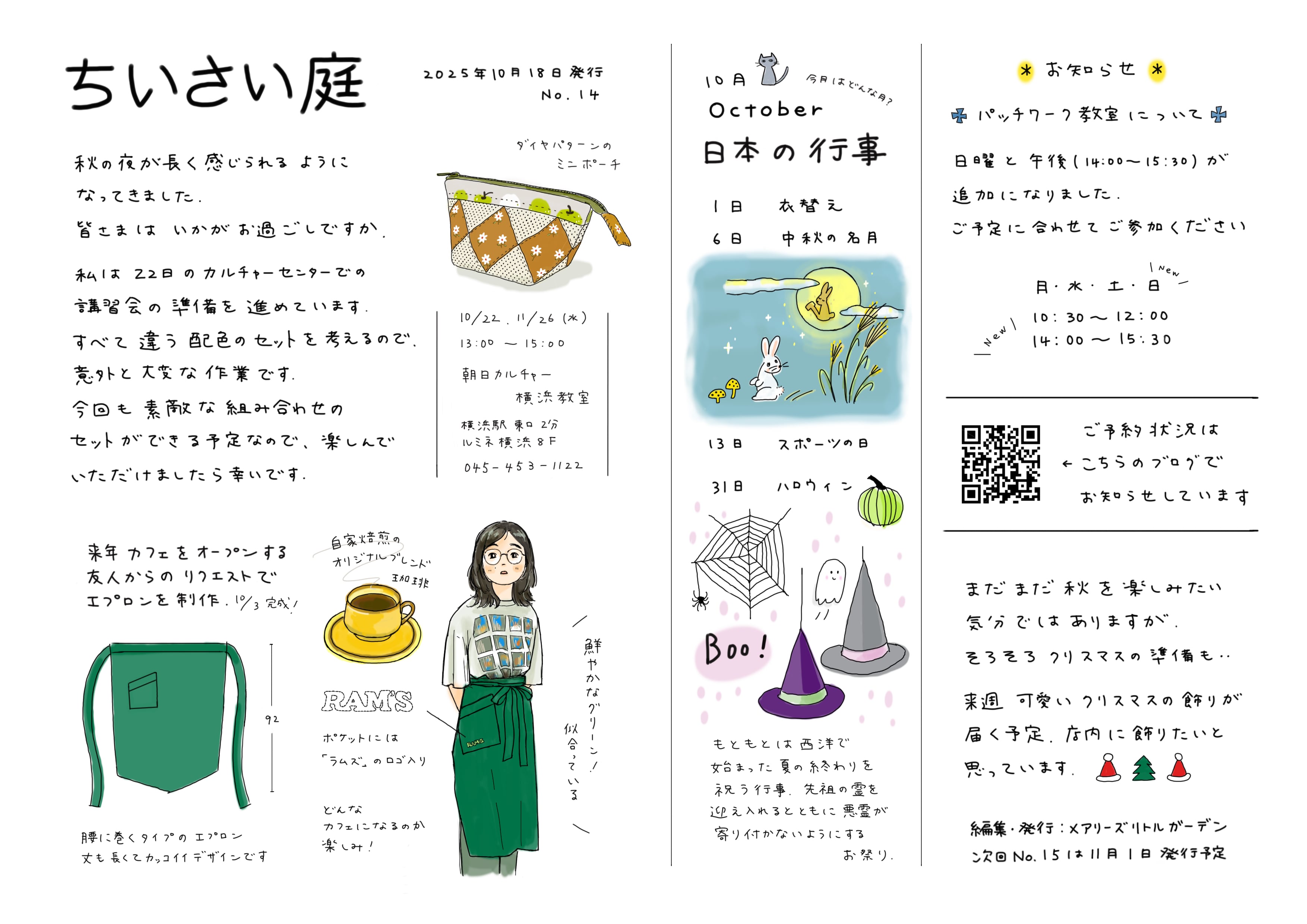 「ちいさい庭」No.14を発行しました。お手元でゆっくり読みたい方はセブンイレブンのネットプリントから印刷もできます。プリント予約番号「46910519」プリント有効期限「10月31日(金) 23:59まで」【印刷方法】・お近くのセブンイレブンへ向かう・コピー機を探す・「プリント」を選択・「ネットプリント」を選択・プリント予約番号「46910519」を入力→「確認」ボタンを押す・内容を確認して「これで決定」ボタンを押す・「プリントスタート」ボタンを押してプリント